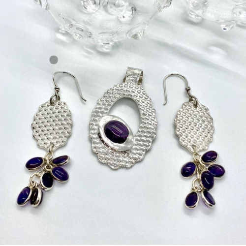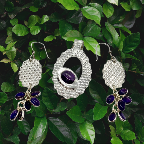 Petal-like purple stones cascade gently beneath textured silver. A fluid, elegant set that feels both playful and deeply refined.