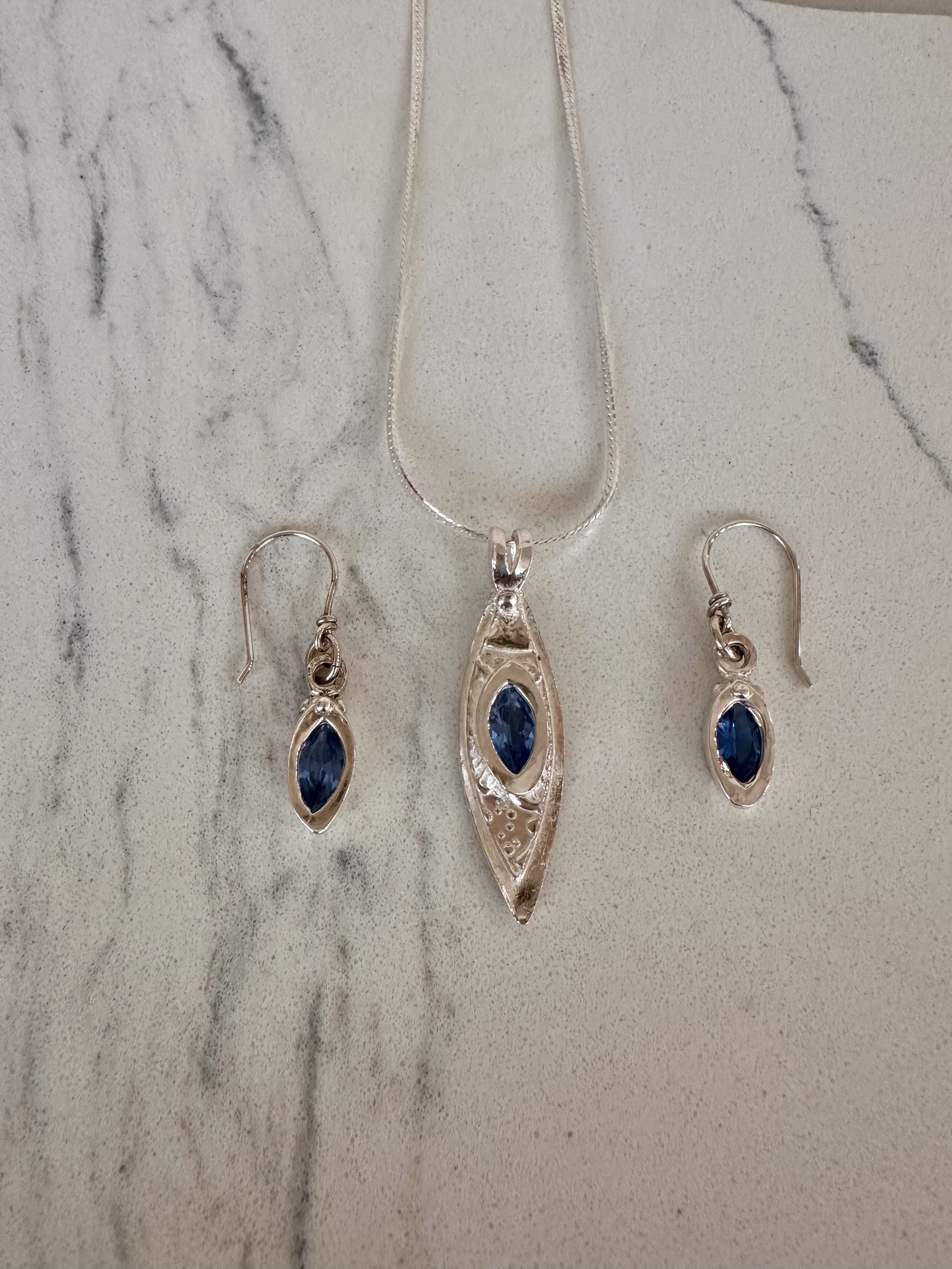 Sterling silver pendant and earrings set with blue CZs stones.