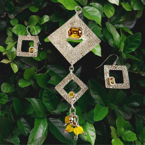 Warm yellow stones glow within open silver frames, finished with a playful drop detail. Bright, joyful, and full of energy—like wearable sunlight.