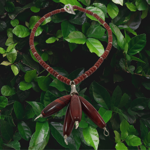 Rich red beads gather into three sculptural drops, bold yet balanced. A grounded statement piece that carries warmth, strength, and movement.