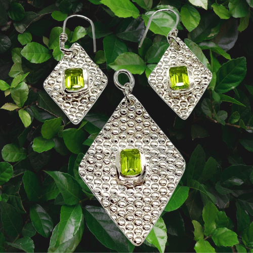 Fresh green stones float within textured silver frames, blending structure with organic beauty. A modern set inspired by nature and clean lines.